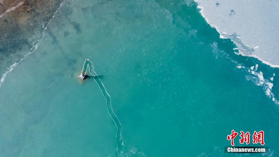 12月21日,航拍冬日青海湖。冬日青海湖周圍的積雪將湛藍的湖面包裹起來,不斷上凍的湖面猶如一面鏡子。(無人機照片) 中新社記者 李江寧 攝