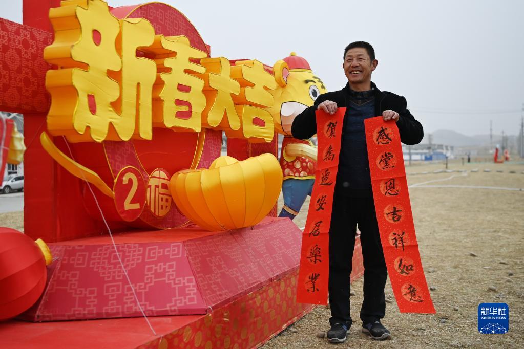 1月25日,在蘭州新區(qū)舟曲避險搬遷安置點,搬遷群眾展示領(lǐng)取的春聯(lián)。新華社記者 范培珅 攝