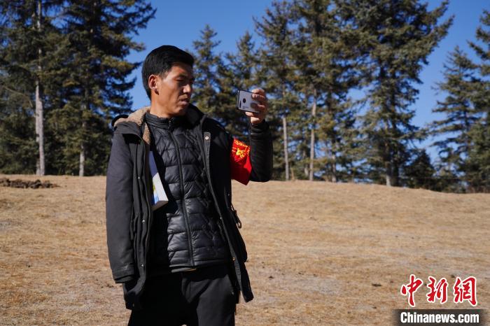 圖為桑杰加用手機(jī)記錄自己巡護(hù)的林場。 馬銘言 攝