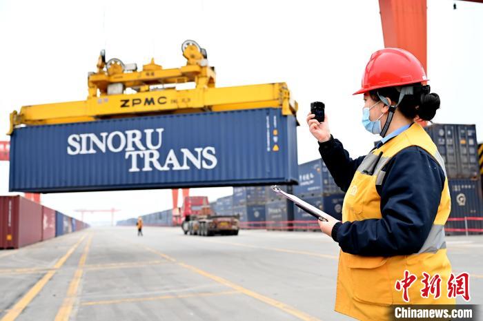 圖為周祖瑾用記錄儀記錄中歐班列集裝箱相關(guān)信息。鄧文鑫 攝