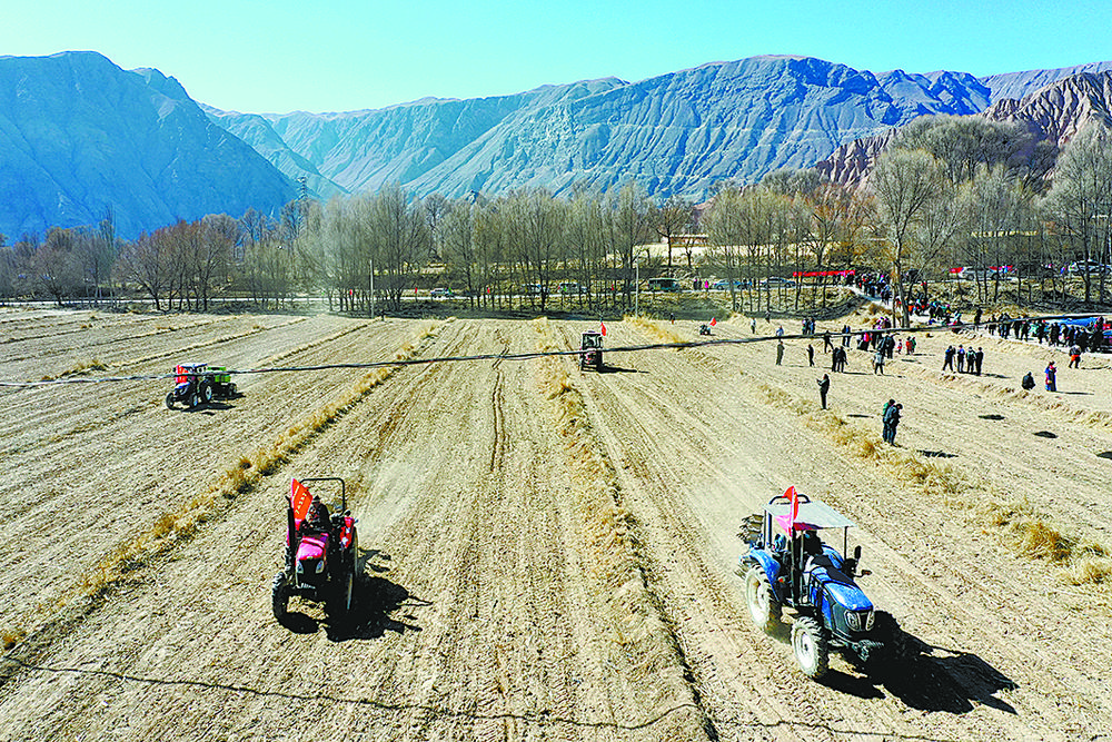 “轟隆隆……”,這邊地頭還沒拍攝過癮,那邊現(xiàn)代化的農(nóng)耕機械齊登場,在鮮艷的彩旗襯托下,“鐵牛55”“東方紅28”為代表的拖拉機車尾連著磨地的木板齊刷刷上場,磨地機械一過,那些裸露在地面的青稞和略微大點的土塊被磨平填埋平整,揚起的塵土淹沒了操作拖拉機群眾的表情,隨著機器擺動著身姿自娛自樂,農(nóng)田之上一派傳統(tǒng)與現(xiàn)代交融的勞作之景呈現(xiàn)在眼前。
