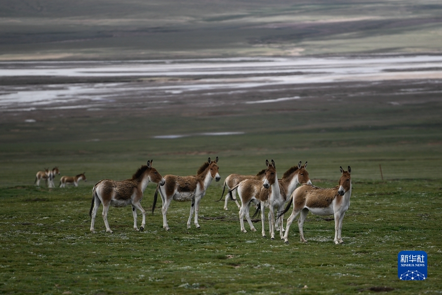 在三江源地區(qū),一群藏野驢在草原上活動(2021年7月25日攝)。新華社記者 張龍 攝