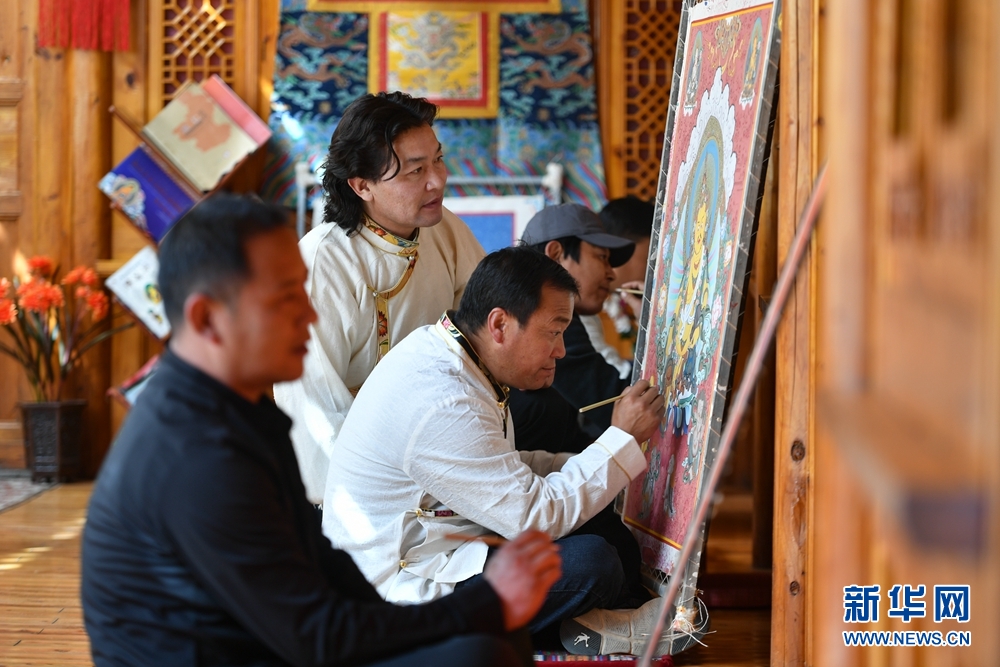 格桑嘉措指導(dǎo)徒弟喬丹(左一)繪制唐卡。跟隨格桑嘉措學(xué)習(xí)繪畫12年的喬丹雖然已經(jīng)出師,但他時(shí)不時(shí)還會(huì)向格桑嘉措請(qǐng)教繪畫技巧。如今,喬丹通過(guò)學(xué)習(xí)繪制唐卡,開(kāi)創(chuàng)了公司,帶了徒弟。