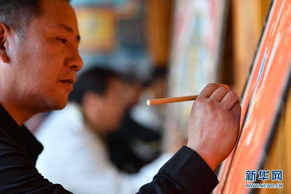 作為熱貢藝術(shù)傳承人及致富帶頭人,格桑嘉措2013年創(chuàng)辦了格桑熱貢藝術(shù)傳播中心,在自己居住的四合院中設(shè)立唐卡展廳,收徒辦學(xué),累計(jì)培養(yǎng)熱貢藝人30多人。圖為格桑嘉措的徒弟達(dá)巴在繪制唐卡。