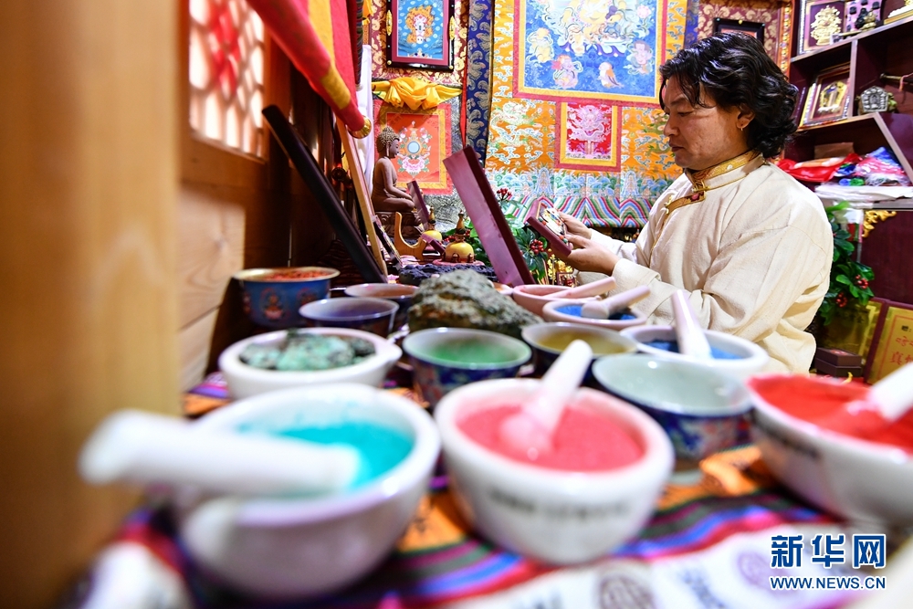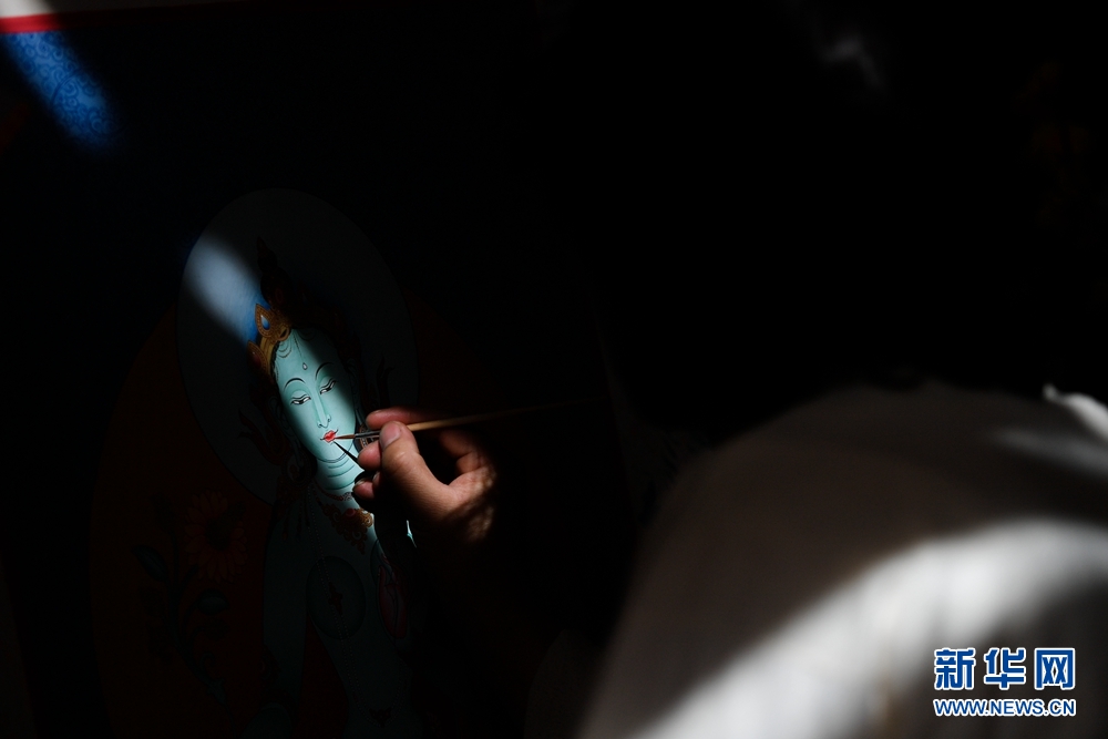 為了更好地傳承和發(fā)揚(yáng)熱貢唐卡繪畫技藝,格桑嘉措又相繼拜多名唐卡大師為師,虛心接受指導(dǎo),刻苦練習(xí)唐卡技藝,將大師們高超的繪畫技藝與家傳技藝融會(huì)貫通,使得他的繪畫功底得到了很大的提升。圖為格桑嘉措在繪制唐卡作品。