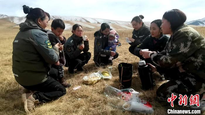 在巡護了一大片林地后,大家聚到一起休息。草原上席地而坐,背著11個月大女兒的索南吉放下孩子,小扎西拿著風鈴逗著妹妹。一壺清茶、一袋干糧、兩個孩子,一群女子交流著巡護情況,不時也會傳出開心的笑聲。
