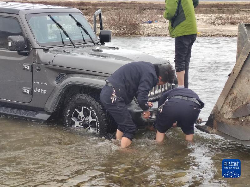 調(diào)來(lái)一輛挖掘機(jī)后,伍金曲批和輔警四郎曲扎卷起褲腿,脫下鞋子就踏進(jìn)冰冷的河水中,一步步淌到越野車(chē)邊,并將拖車(chē)?yán)K索穿到越野車(chē)拖車(chē)鉤上。