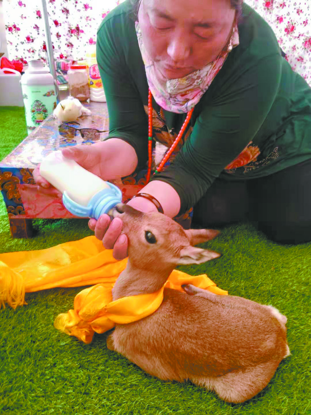 妻子扎西卓瑪始終沒有放棄喂養(yǎng)它,最初的3天,她每天都要花6個多小時,或跪著或趴著,把奶嘴一次次伸進(jìn)“豆豆”口中,但又一次次被吐了出來。一家人整夜操心,輪流給它喂水喂奶,扎西卓瑪還在它的脖子上系了一條黃色的哈達(dá),當(dāng)做“幸運(yùn)結(jié)”,希望小原羚能活下來。