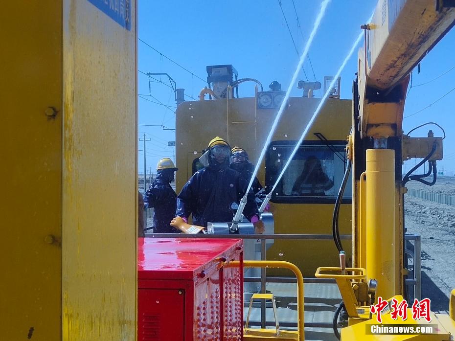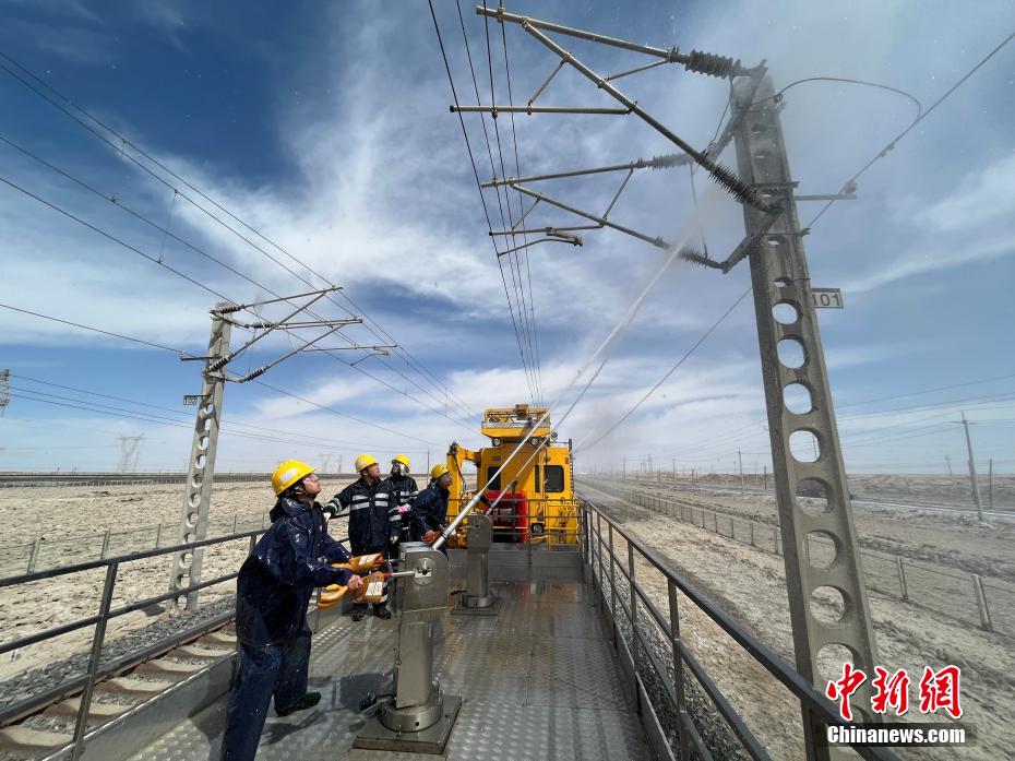 察爾汗鹽湖區(qū)域空氣中鹽分含量高,在這片區(qū)域,春秋季大風(fēng)不僅揚沙還會揚鹽,很容易在鐵路牽引供電接觸網(wǎng)設(shè)備上形成鹽污,造成線路跳閘,遇到雨雪天氣就會放電,造成大面積跳閘,誘發(fā)行車安全事故。圖為接觸網(wǎng)工操作水炮進行清洗作業(yè)。 王文誠 攝