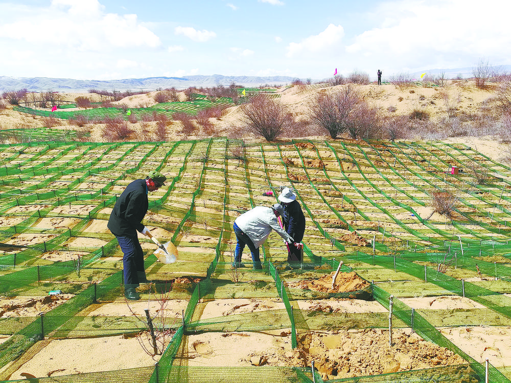 陶銳說:“比如在流動半流動沙丘,我們將工程固沙與生物治沙相結(jié)合。在迎風(fēng)面設(shè)置1.5m×1.5m的草方格沙障,在設(shè)置好的草方格沙障內(nèi)栽植青楊,進(jìn)行烏柳插桿并點(diǎn)播檸條沙蒿等,而在背風(fēng)坡實(shí)行插桿造林。在丘間地,我們則采取植苗造林,栽植烏柳苗和沙棘苗,并用網(wǎng)圍欄進(jìn)行封育等。”
