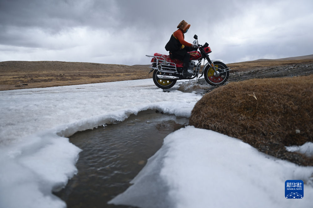 4月21日,在青海省玉樹藏族自治州曲麻萊縣麻多鄉(xiāng)約古宗列曲附近,生態(tài)管護員才仁扎西駕駛摩托車巡護。新華社記者 張龍 攝