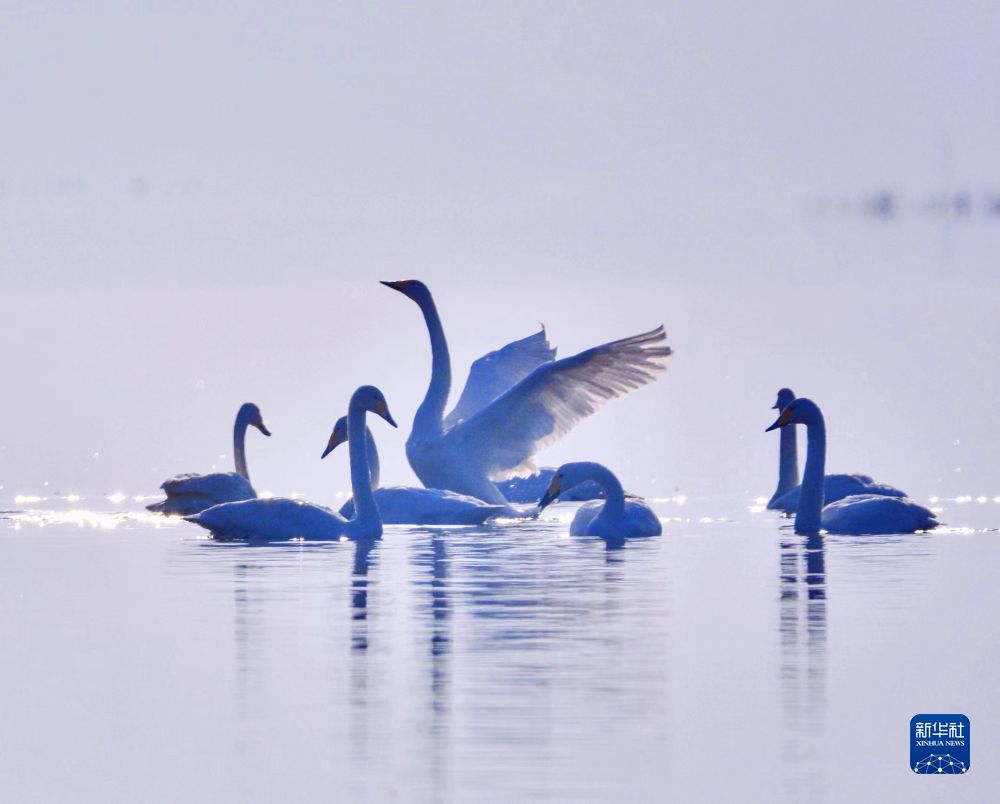 2021年11月23日在青海省海東市化隆回族自治縣境內的黃河濕地拍攝的大天鵝。新華社發(fā) 李玉峰 攝