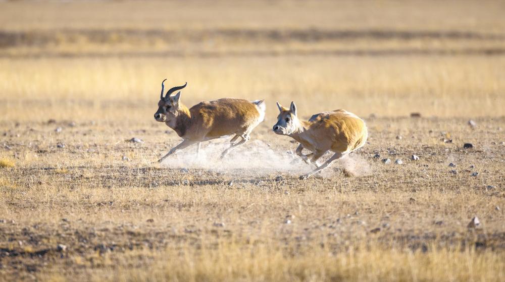 圖為一群藏原羚在山坡上奔跑嬉戲。曹民鍇 攝