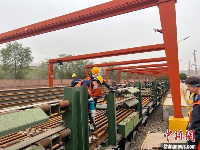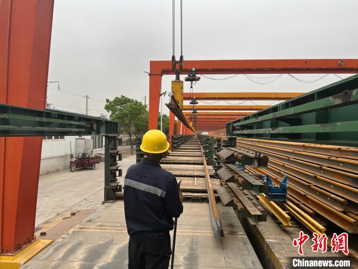 圖為職工正在擺放長軌。張遠 攝