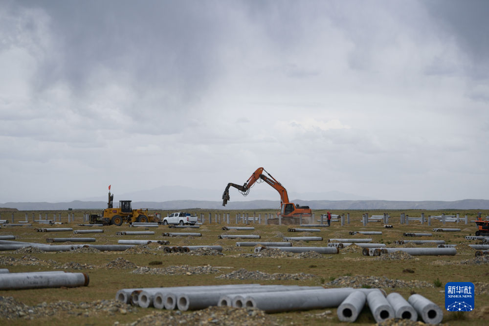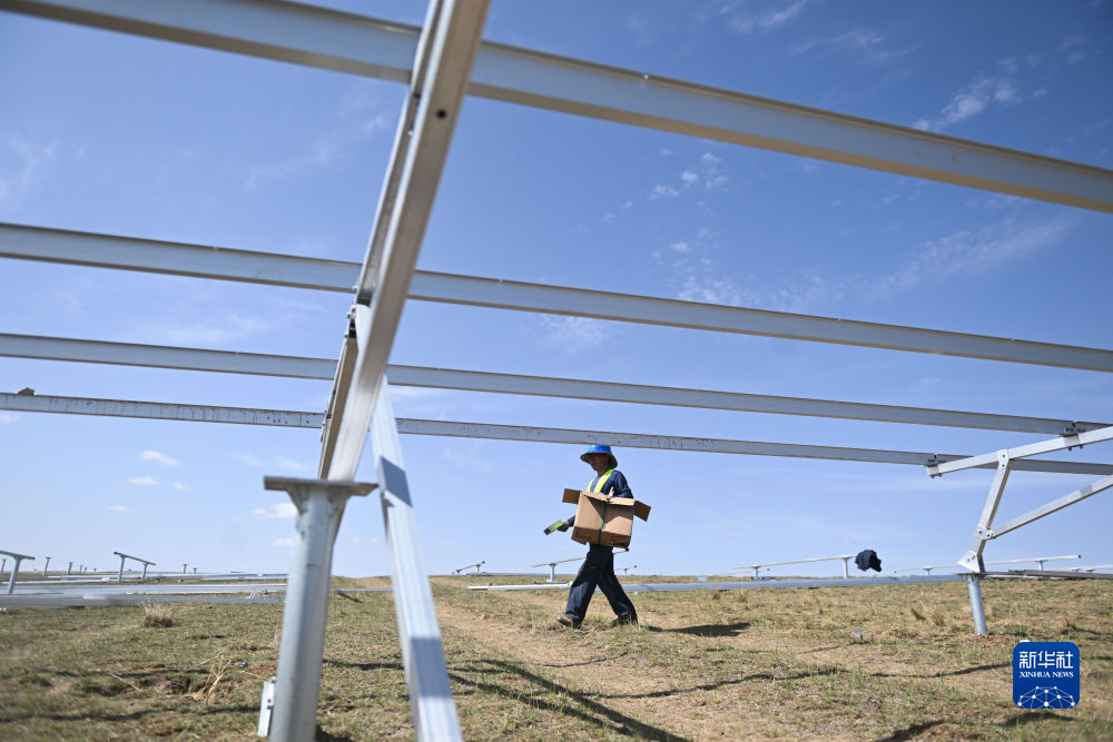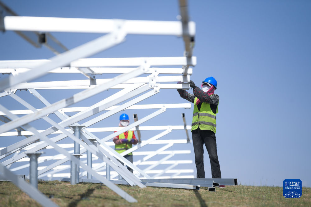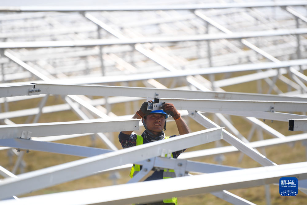 6月8日,工人在黃河上游水電開發(fā)有限責(zé)任公司海南基地共和縣100萬千瓦光伏項目現(xiàn)場施工。新華社記者 駱曉飛 攝