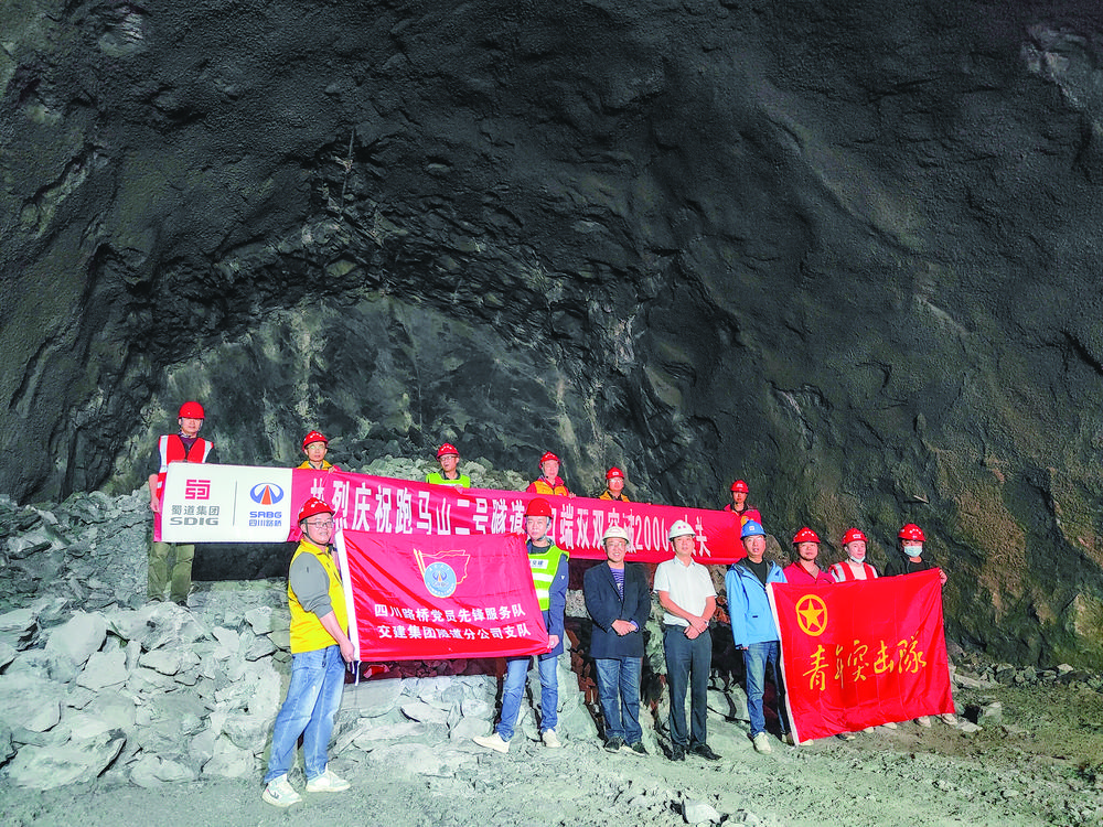 施工人員慶祝跑馬山二號隧道進口端掘進雙破2000米大關(guān)。