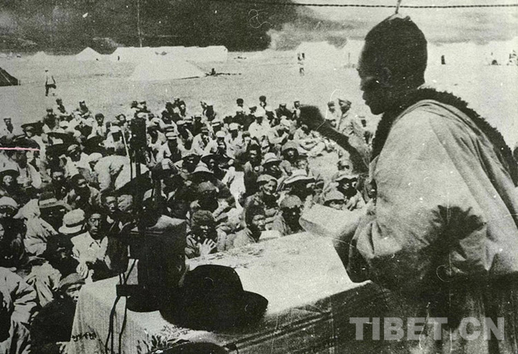圖為1952年8月果洛工作團(tuán)在達(dá)日縣查郎寺召開果洛頭人、代表聯(lián)誼會(huì)議,扎喜旺徐團(tuán)長在聯(lián)誼會(huì)議上作有關(guān)民族團(tuán)結(jié)的報(bào)告 圖片由央金提供