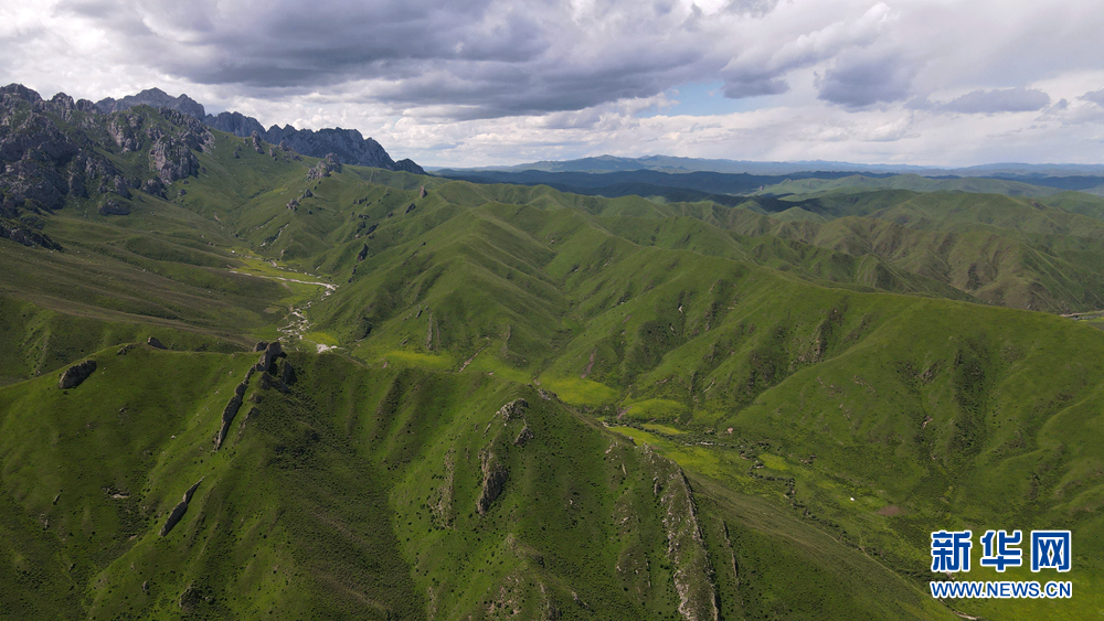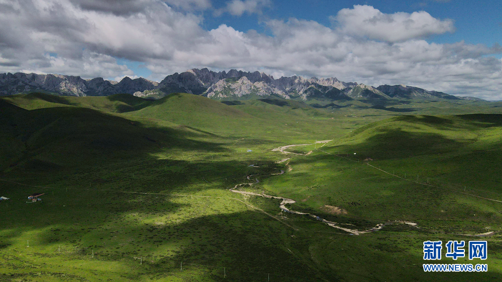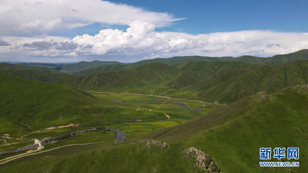 時(shí)值盛夏,青海省黃南藏族自治州河南蒙古族自治縣境內(nèi)的青海洮河源濕地公園,奇峰聳立、水草豐美。藍(lán)天白云之下,高山與草原相映,風(fēng)光旖旎、如詩(shī)如畫。