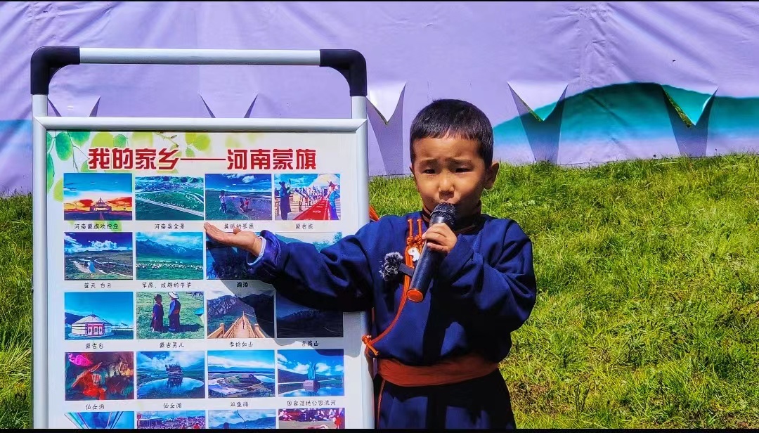 “我的家鄉(xiāng)在中國西部,這里有一片非常美麗的大草原,大家都喜歡叫她‘河南蒙旗’,這里有藍(lán)天、白云、草原、牛羊、湖泊、河流……”來自青海省黃南藏族自治州河南蒙古族自治縣中心幼兒園五歲半的觀卻東珠作為“講解員”,正聲情并茂的向老師、同學(xué)以及家長介紹自己的家鄉(xiāng)。