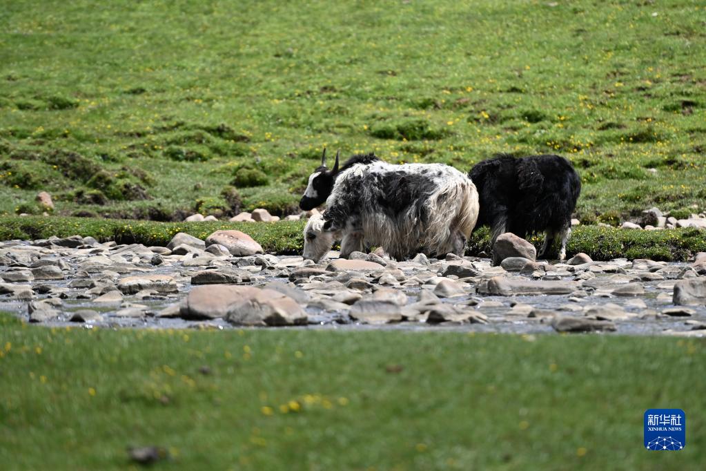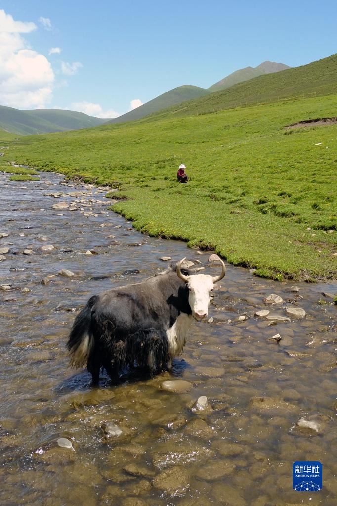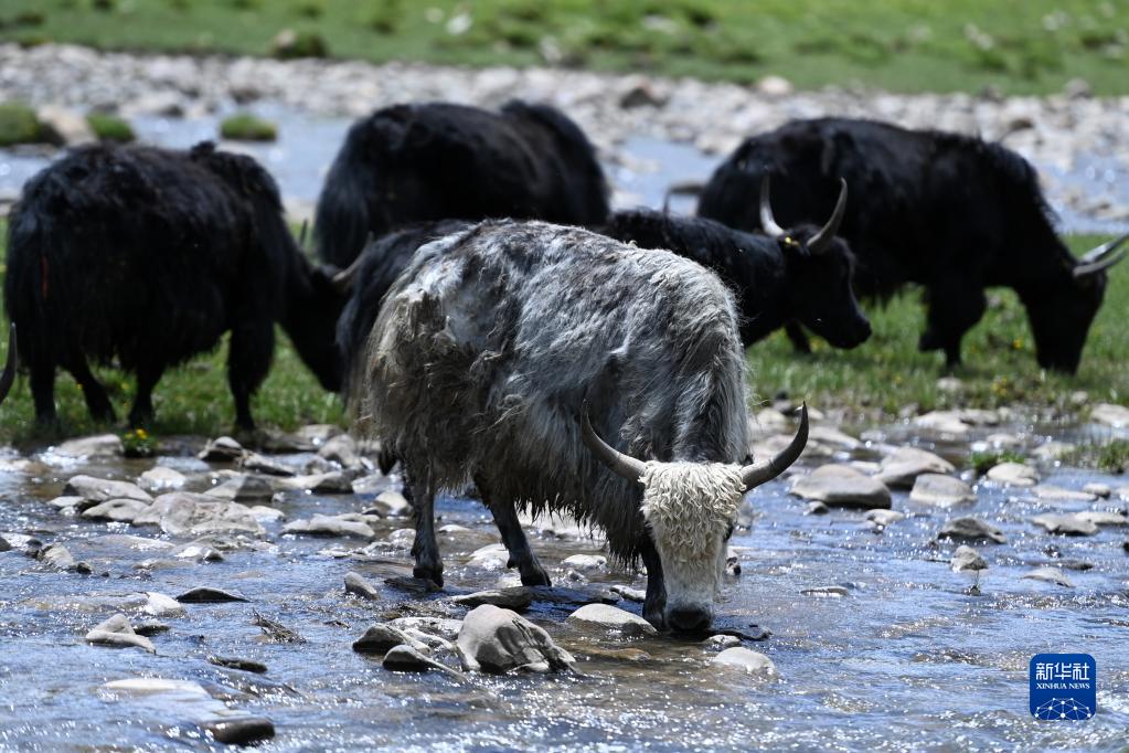 在稱多縣歇武鎮(zhèn)牧業(yè)村,牦牛在河道中飲水(7月4日攝)。新華社記者 范培珅 攝