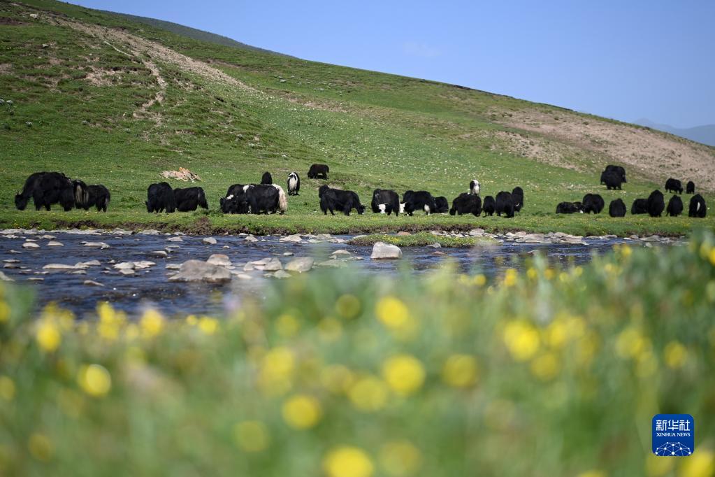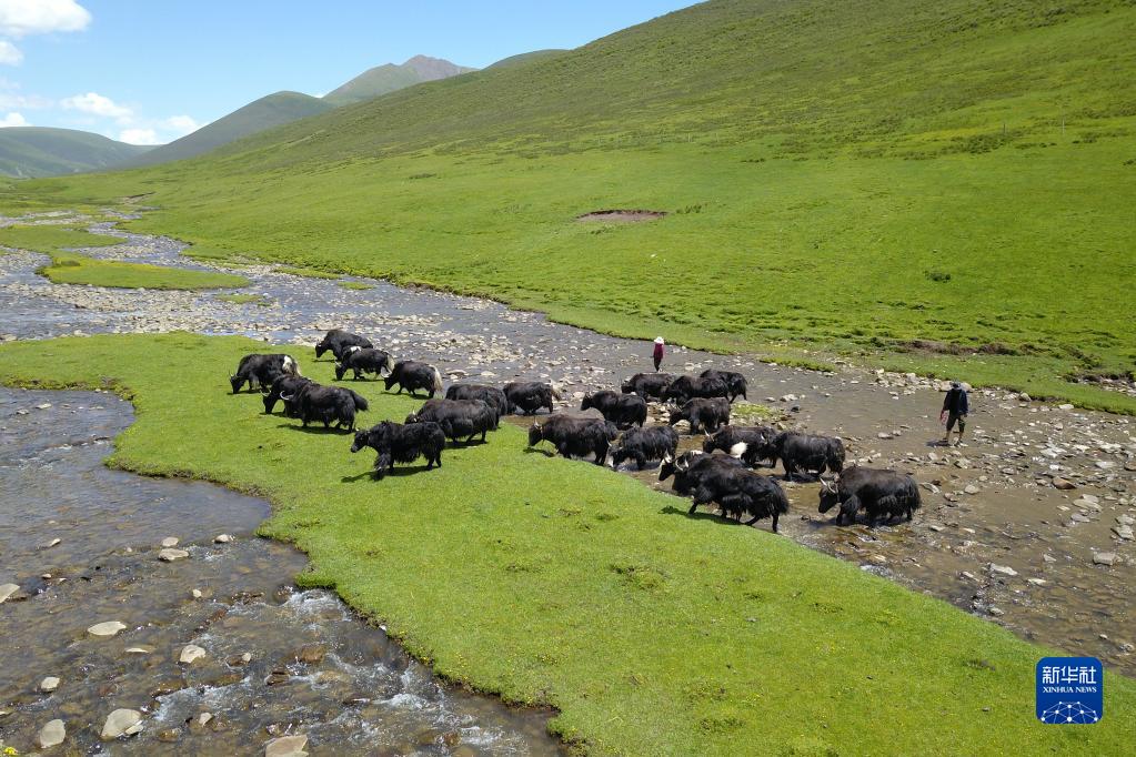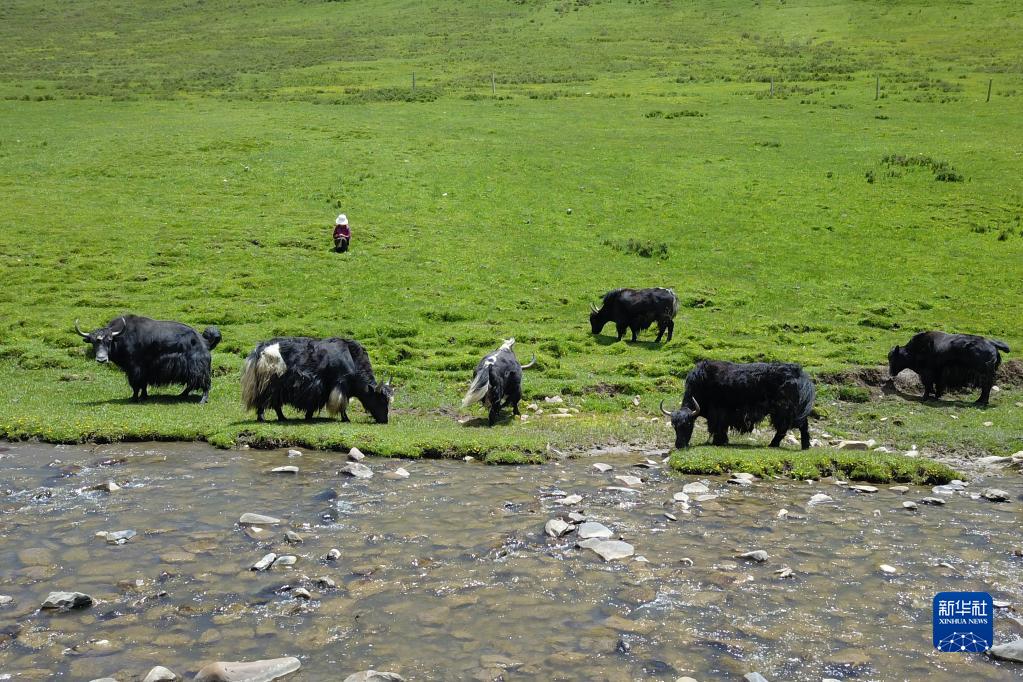 在稱多縣歇武鎮(zhèn)牧業(yè)村,牦牛在河邊飲水(7月4日攝)。新華社記者 范培珅 攝