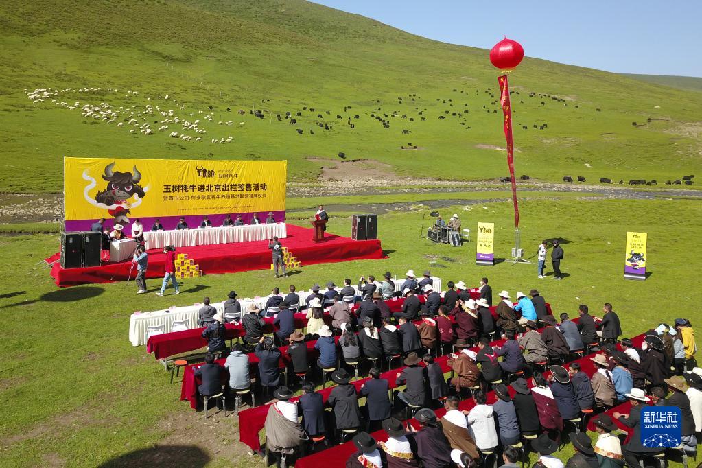 這是7月5日在稱多縣歇武鎮(zhèn)牧業(yè)村拍攝的玉樹牦牛進北京出欄簽售活動現場(無人機照片)。新華社記者 范培珅 攝