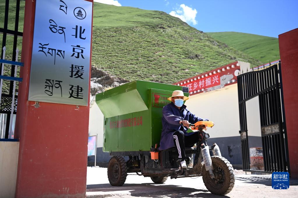 在稱多縣歇武鎮(zhèn)牧業(yè)村的牦牛養(yǎng)殖基地,工作人員駕駛自動撒料車駛向牛舍(7月4日攝)。新華社記者 范培珅 攝