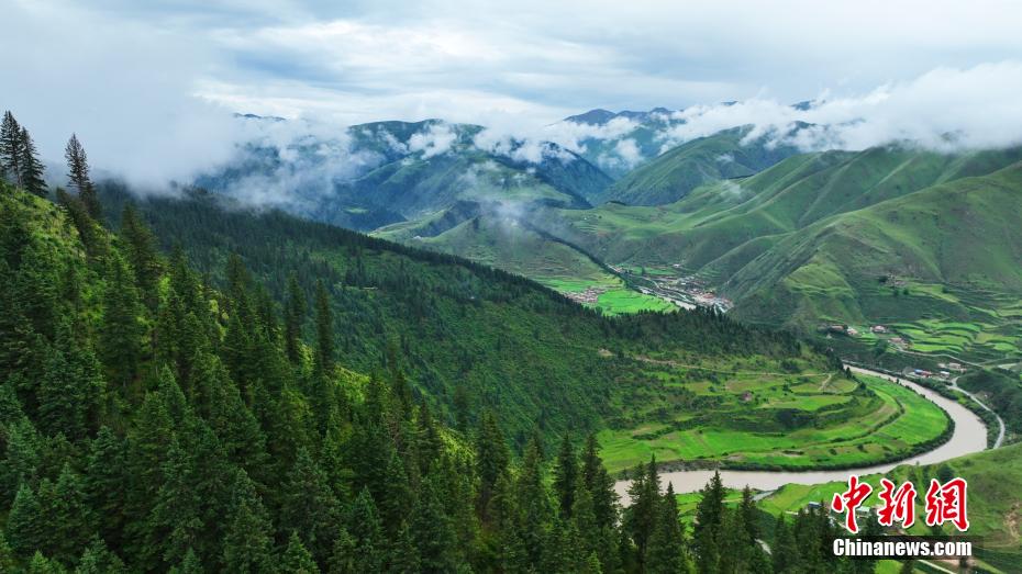 7月11日,一場降雨過后,云霧如潔白的哈達(dá)飄落在青海省果洛藏族自治州班瑪縣瑪可河國家森林公園山頭,與樹木、河流、梯田相互映襯,自然風(fēng)景美如畫。