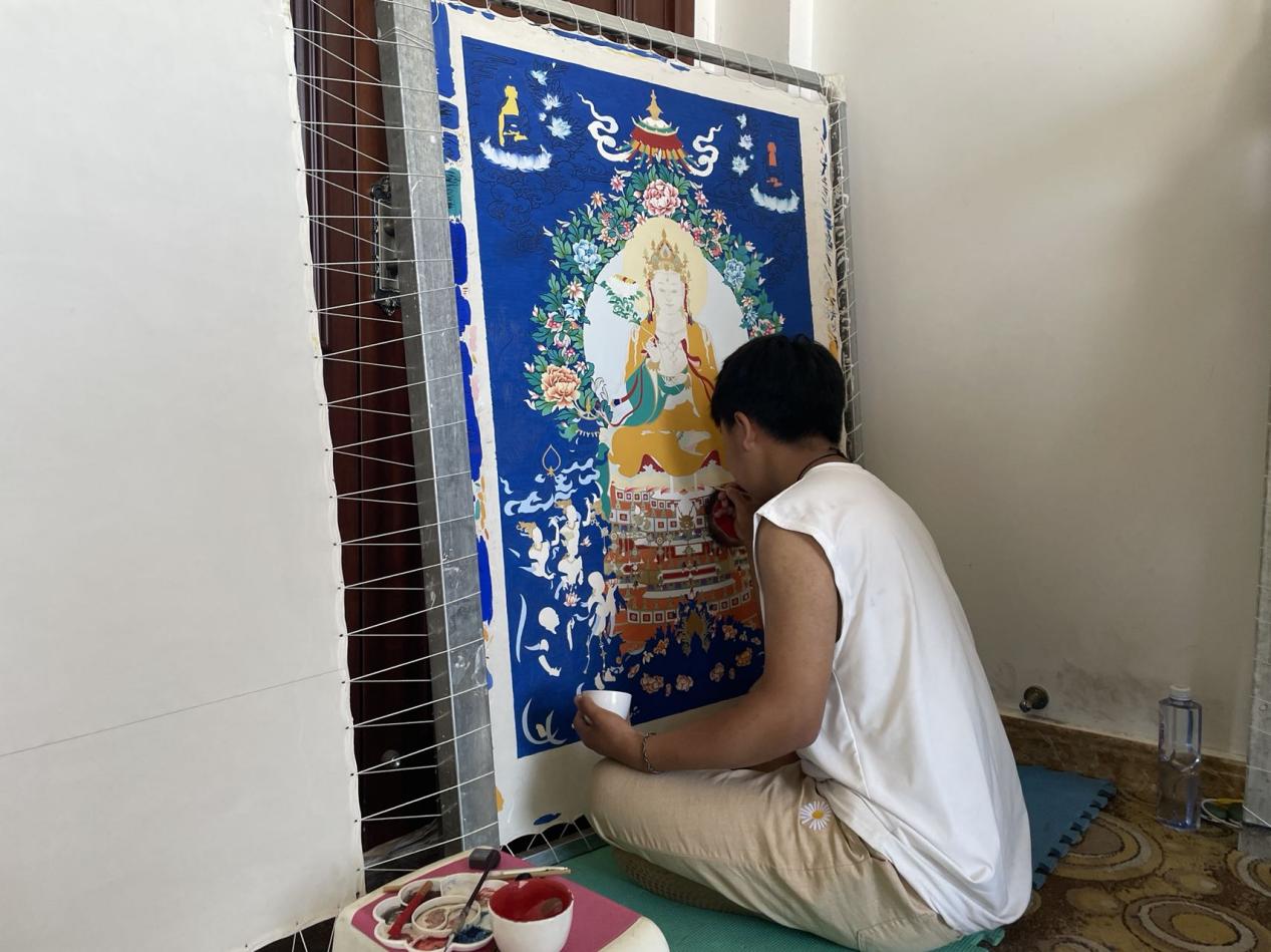 為唐卡上色。人民網 況玉 攝