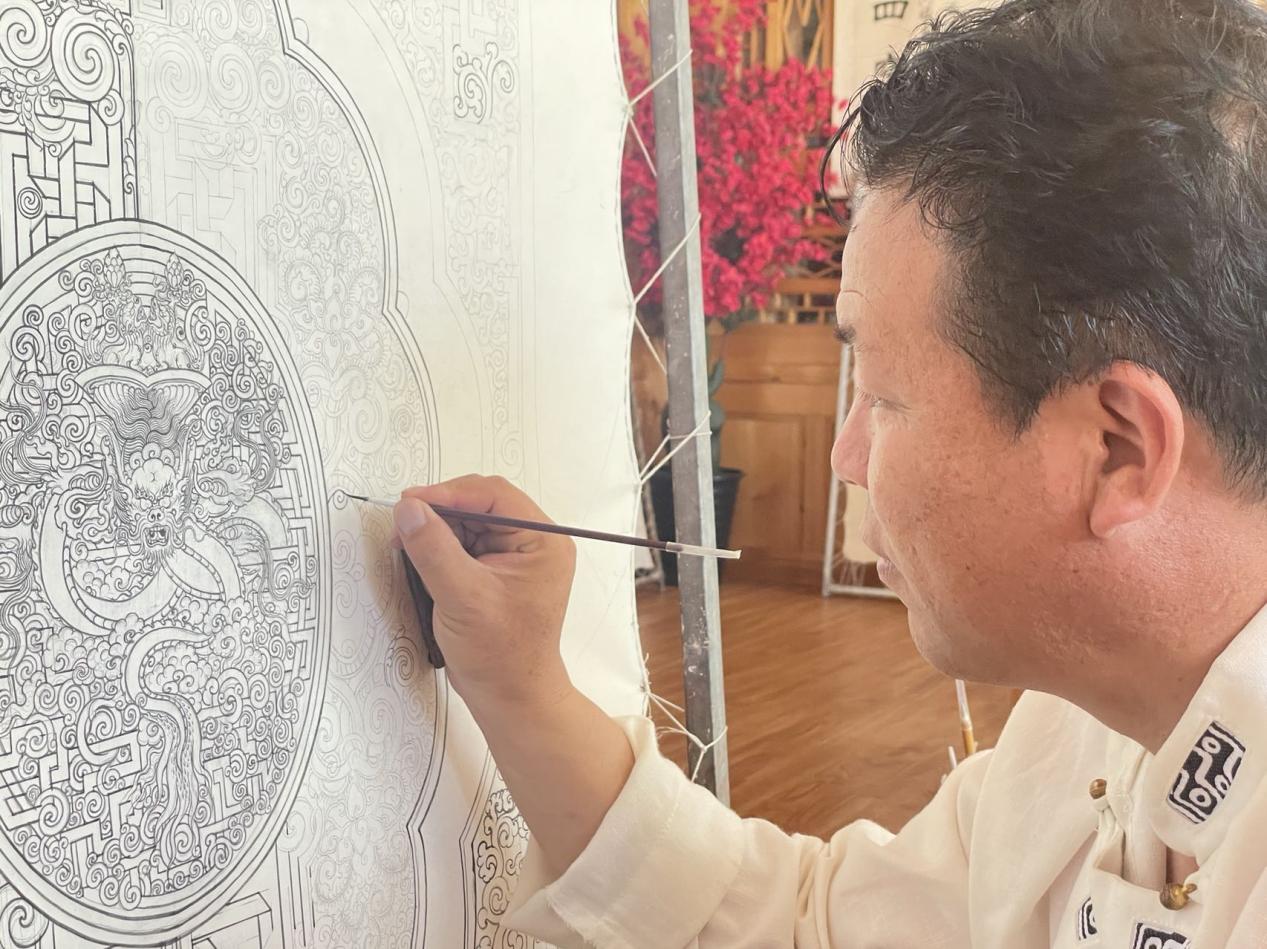 更登正在繪制白描圖案。人民網 況玉 攝