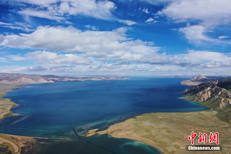 冬格措納湖位于青海省果洛藏族自治州瑪多縣,是一片地處海拔4100多米的淡水湖。夏日的冬格措納湖,湖水湛藍(lán),宛如跌落群山之中的“藍(lán)寶石”。紅、黃、綠色的草灘與湖水相互映襯,美景如畫(huà)。圖為航拍冬格措納湖美景。 馬銘言 攝