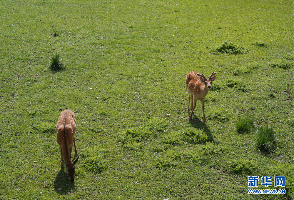 祁連鹿場,兩只梅花鹿正在愜意地吃草、漫步。新華網(wǎng) 卡婭梅朵 攝