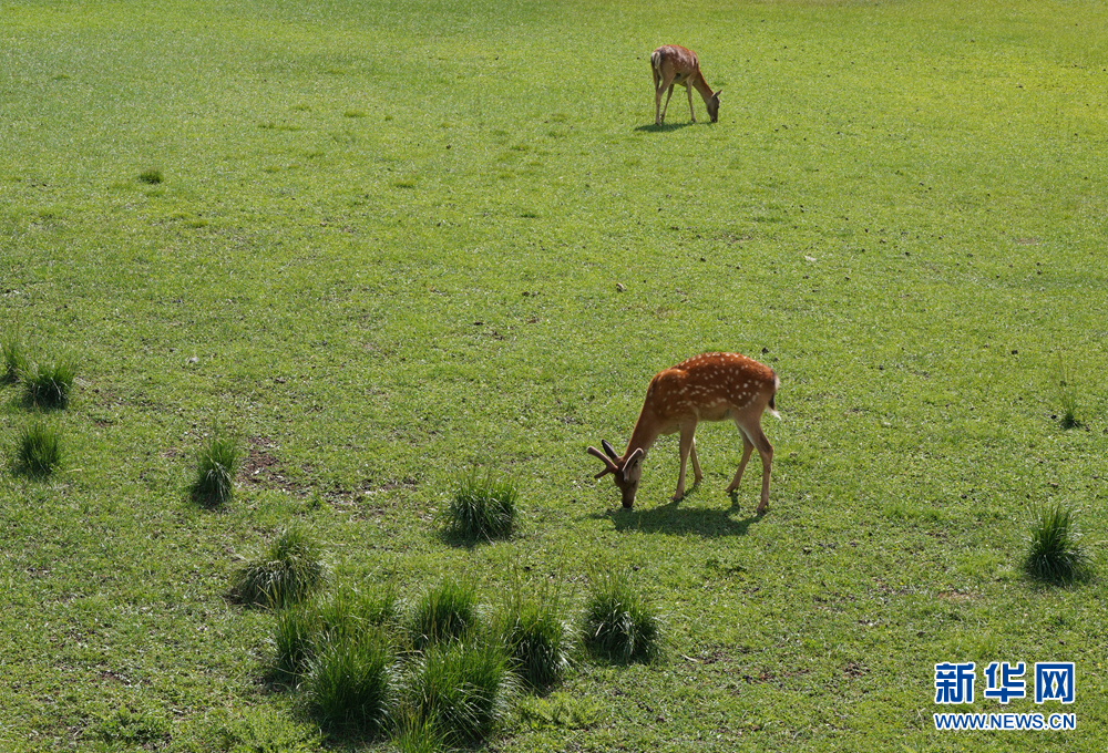 祁連鹿場,兩只梅花鹿正在愜意地吃草。新華網(wǎng) 卡婭梅朵 攝
