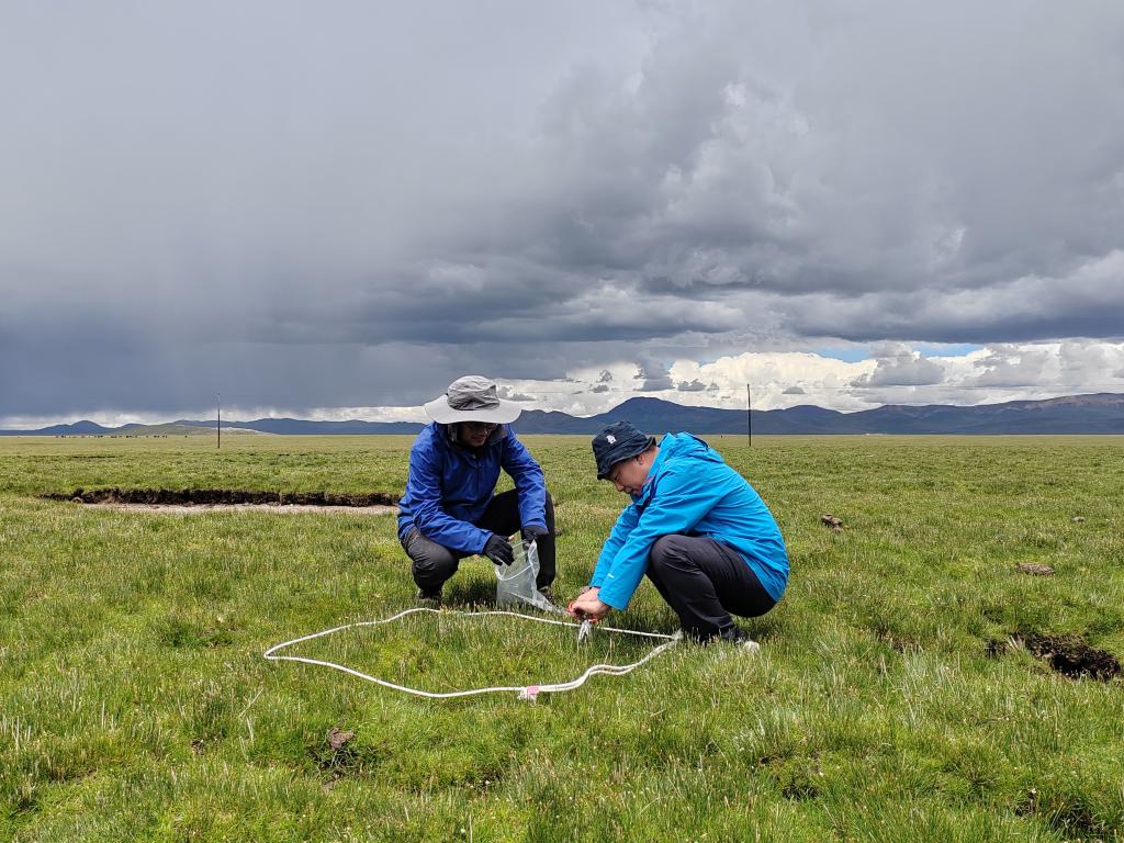 7月17日,科考隊(duì)員任斐鵬(右)和孫寶洋在觀測自然狀態(tài)下高寒草甸生態(tài)系統(tǒng)狀況。(受訪者供圖)