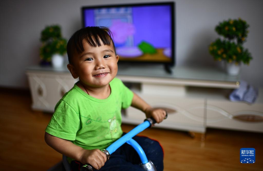 在青海省黃南藏族自治州河南蒙古族自治縣易地扶貧搬遷安置小區(qū)幸福家園,智后茂村牧民旦卻卓瑪?shù)膬鹤恿_藏智華在家中玩耍(2018年6月13日攝)。新華社記者 張宏祥 攝