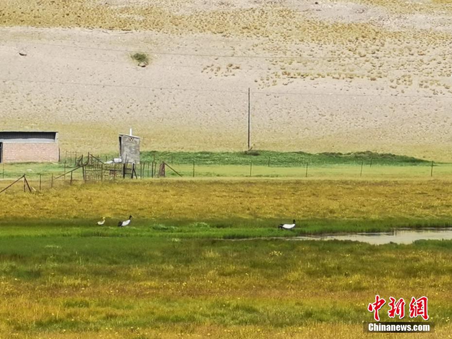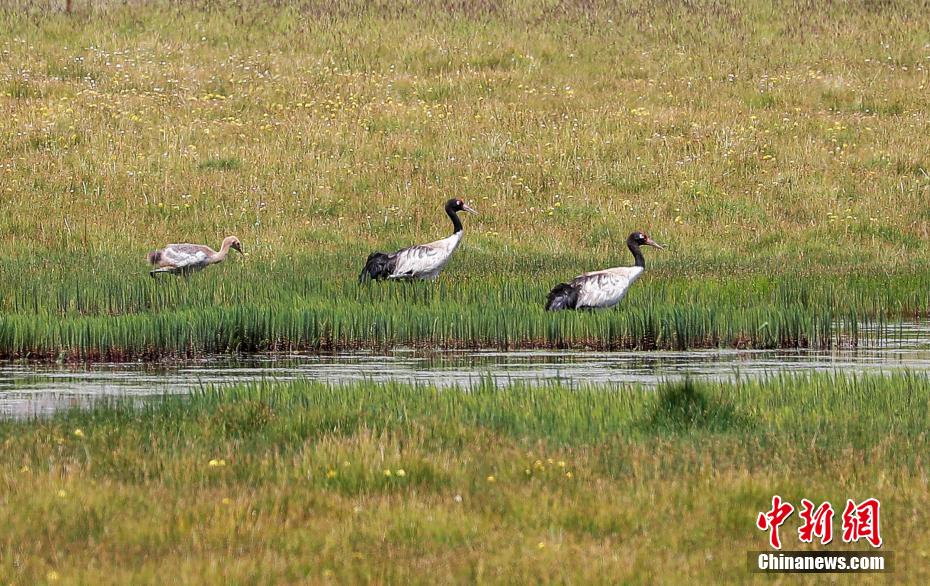 8月9日,祁連山南麓的青海省海北藏族自治州祁連縣央隆鄉(xiāng),三只黑頸鶴正在央隆濕地悠閑踱步,不時(shí)發(fā)出鳴叫聲。黑頸鶴是大型飛行涉禽,頸的上部為黑色,故稱黑頸鶴。每年,黑頸鶴在春季遷徙到繁殖地,秋季到達(dá)越冬地,是世界上唯一生長(zhǎng)、繁殖在高原的鶴。
