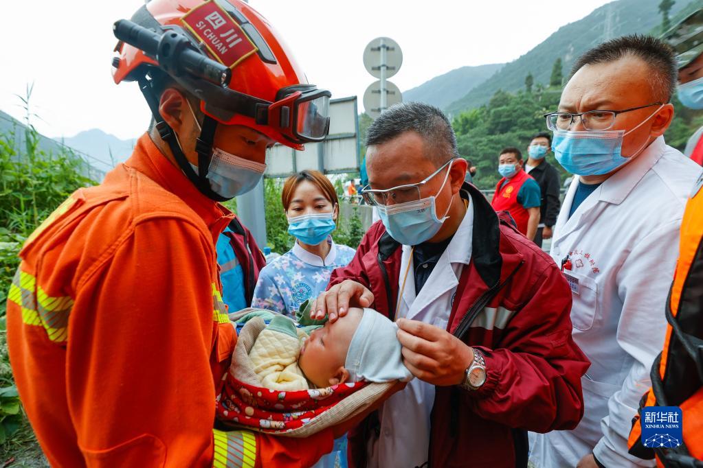 9月6日,阿壩森林消防支隊汶川大隊隊員張自立將一名從瀘定縣得妥鎮(zhèn)灣東村疏散出來的2個月大的嬰兒,交給瀘定縣人民醫(yī)院醫(yī)生。新華社記者 沈伯韓 攝