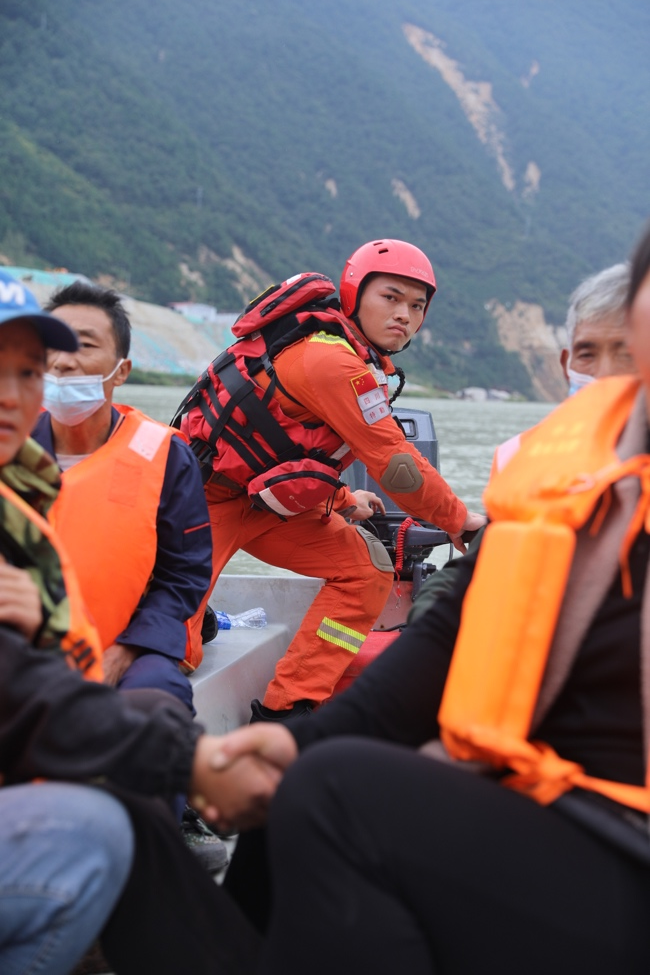 大渡河水奔涌流去,但穿梭于各個村莊間的救援人員毫無畏懼。我們隨救援人員一起坐上沖鋒舟,兩岸的山上不斷有滾石滑落。