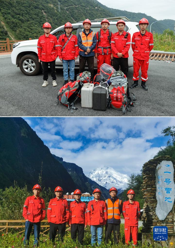這是一張拼版照片,上圖為:9月7日,四川省冶勘設(shè)計集團有限公司的6名調(diào)查隊員在搭乘直升機去往海螺溝前拍攝的合影(新華社記者沈伯韓攝);下圖為:9月10日,6名調(diào)查隊員在海螺溝景區(qū)一號營地拍攝的合影(四川省冶勘設(shè)計集團有限公司供圖)。新華社發(fā)