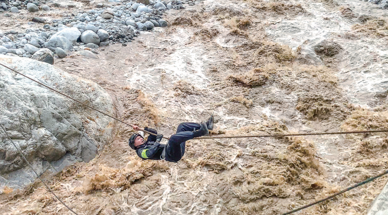 焦慮之際,另一組隊(duì)員沿河搜尋發(fā)現(xiàn)一塊離河對(duì)岸較近的巨石,率先過(guò)河的戰(zhàn)友打錨點(diǎn)接應(yīng),很快在兩邊架起一座“飛索橋”,曾經(jīng)當(dāng)過(guò)高山向?qū)У耐跞f(wàn)銳第一個(gè)沖上去,四肢倒掛,背對(duì)激流,飛快移向?qū)Π丁>o接著,隊(duì)員沙馬澤呷躍上飛索。鋼索和飛索兩路同時(shí)過(guò)河,隊(duì)伍很快全部來(lái)到對(duì)岸。