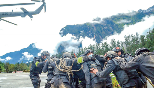“9·5”地震發(fā)生前兩周,特警支隊(duì)舉行了一次警務(wù)技能大比武。比武科目包括高海拔山地武裝奔襲、簡(jiǎn)易擔(dān)架制作、傷員應(yīng)急處理、傷員轉(zhuǎn)運(yùn)、結(jié)繩……兩周后,他們來(lái)到另一個(gè)比武場(chǎng),這一次是與死神較量。