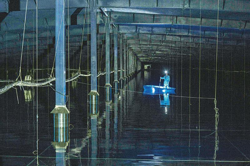 24日,陳明君和同事穿上潔凈服、戴上腳套,劃著小船進入伸手不見五指的三號水池,他們要逐一檢查維護這里的探測器單元和電子學(xué)箱。船劃到指定位置,黑暗中陳明君的頭燈光束直射水底,水下碩大的探測器單元核心設(shè)備——光電倍增管,被照得清晰可見,他和同事一起用“鉤子”把光電倍增管拉起,進行檢查?!八乩锏纳疃仁?.5米,這些純凈水的透明度比自來水高三倍以上,切倫科夫光就從里面捕獲?!标惷骶嬖V記者。