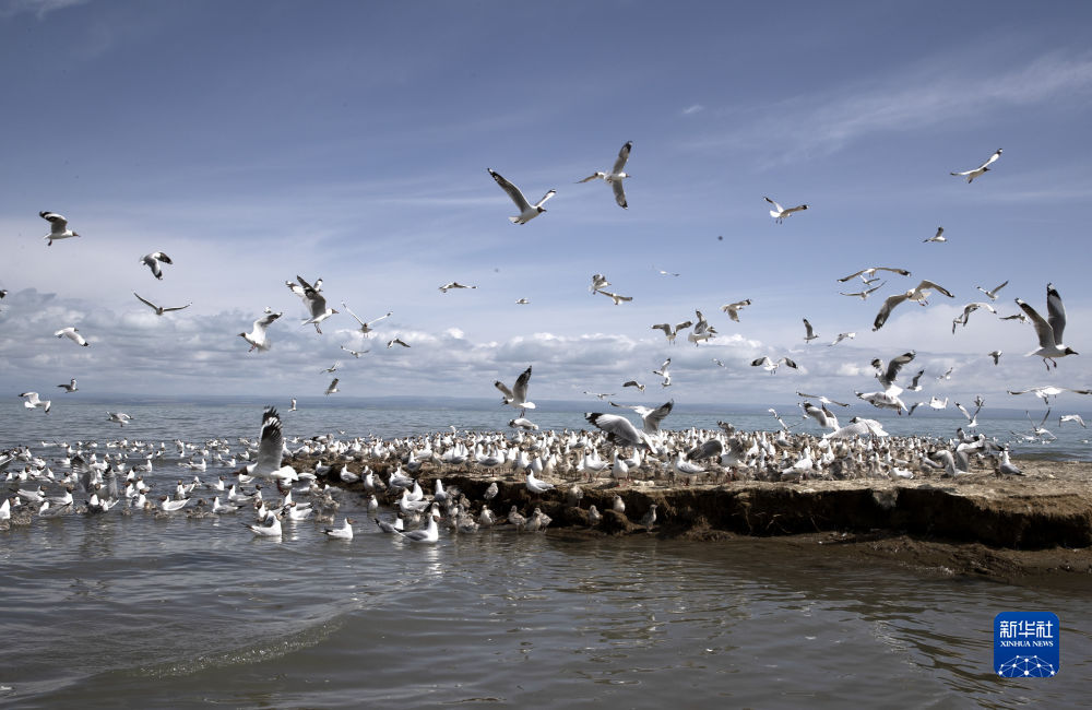 一群水鳥在青海湖鳥島濕地活動(2021年7月1日攝)。新華社 星智 攝