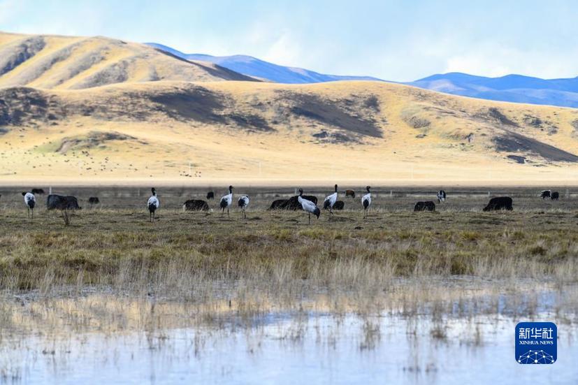 一群國家一級保護動物黑頸鶴在四川省阿壩藏族羌族自治州若爾蓋縣的濕地活動(2022年10月17日攝)。新華社記者 王曦 攝
