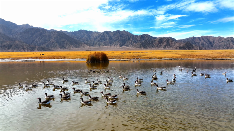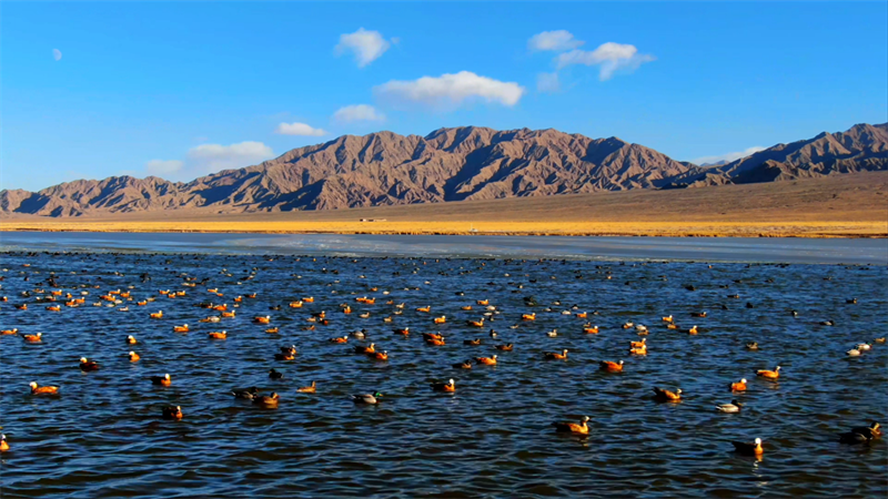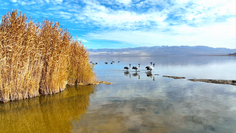 初冬時(shí)節(jié),在青海省海西蒙古族藏族自治州烏蘭縣都蘭湖國家濕地公園內(nèi),四只國家一級保護(hù)動(dòng)物黑頸鶴,踏著黑色細(xì)長的腿在湖中閑庭信步,與斑頭雁、赤麻鴨一起嬉戲覓食,盡顯柴達(dá)木盆地濕地生態(tài)之美。