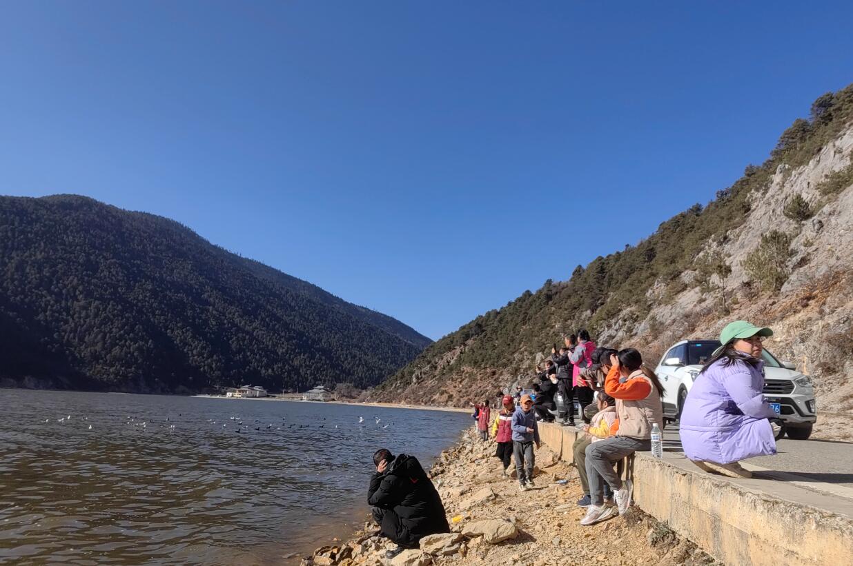 1月28日,記者在納帕海自然保護區(qū)看到成群的海鷗在這里盤旋飛舞,不少游客手托面包進行投喂,一幅幅人與自然和諧共生的美好畫卷徐徐鋪開?!暗谝淮蝸硐愀窭锢吹讲簧儆慰驮谶@里投喂海鷗,我也買一袋來試試?!庇慰屯蹊b詳說。