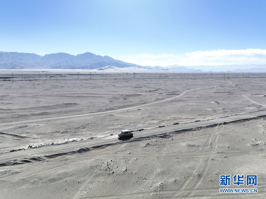 2月5日,青藏集團(tuán)有限公司西寧供電段格爾木檢修車間工長(zhǎng)王永忠與同事駕車前往變電所進(jìn)行巡檢(無(wú)人機(jī)照片)。新華社記者 張龍 攝