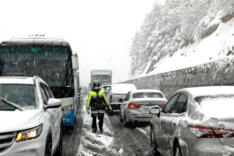 2月22日,大雪使白馬雪山路面積雪結(jié)冰,導致上百輛汽車擁堵滯留,交警冒著嚴寒疏導交通。[詳細]
