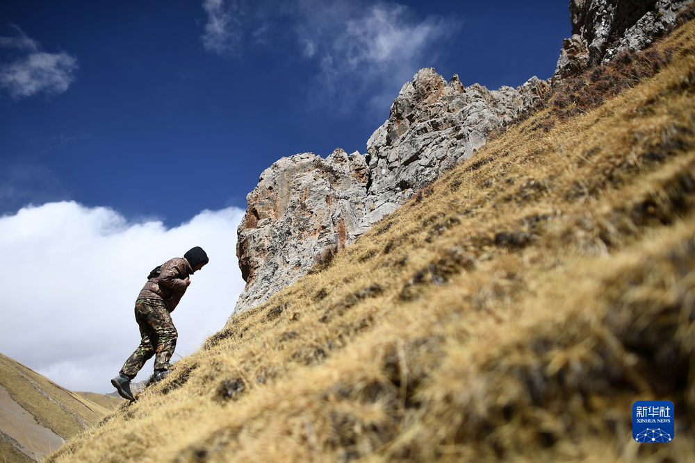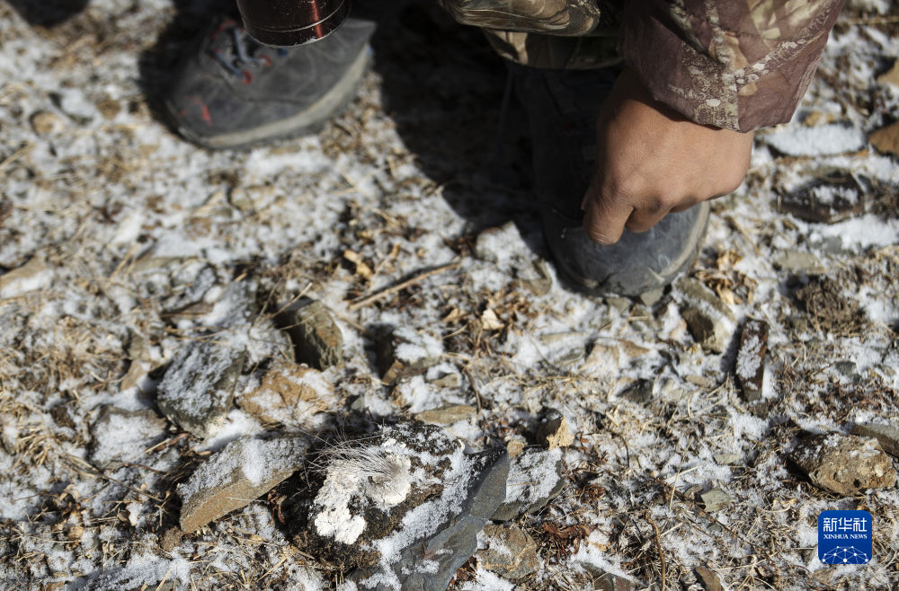 2月21日,更求曲朋在昂賽大峽谷里巡護時查看巖羊留下的毛發(fā)。新華社記者 費茂華 攝