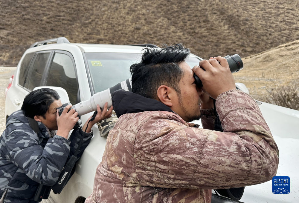 2月21日,更求曲朋(右)和才仁尼瑪在昂賽大峽谷里觀察遠處的雪豹。新華社記者 費茂華 攝